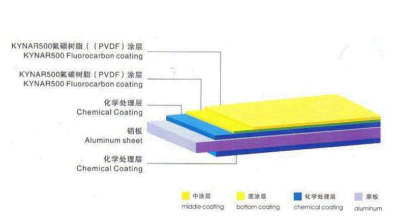 鋁單板是指經過鉻化等處理后,再采用氟碳噴涂技術,加工形成的建筑裝飾材料。氟碳涂料主要是指聚偏氟乙烯樹脂(KANAR500),分底漆、面漆、清漆三種。